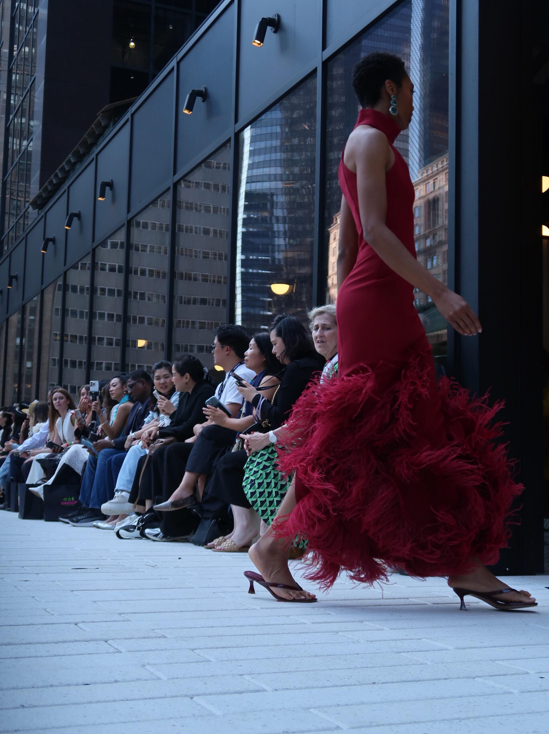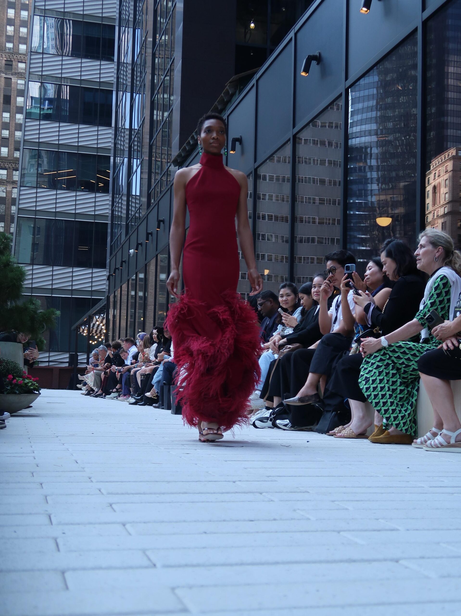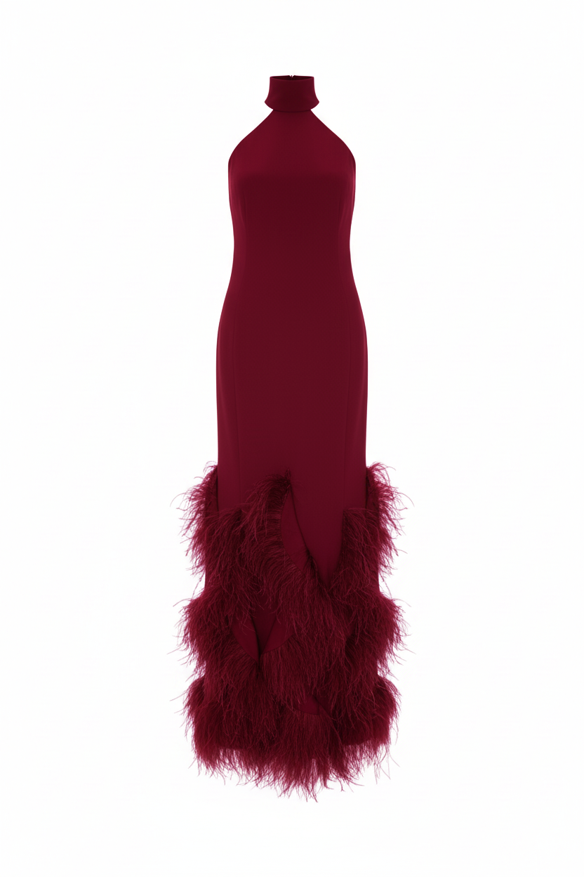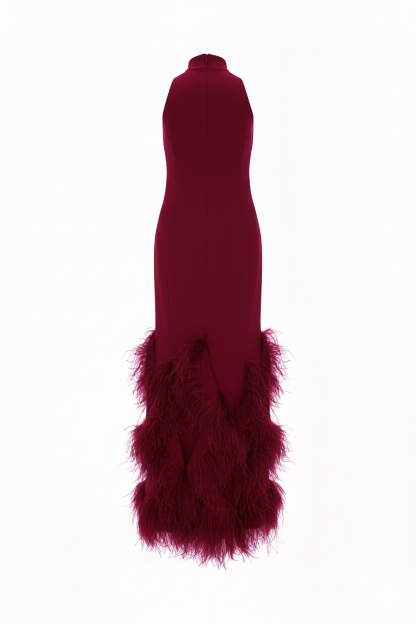 Rich bordeaux feathers cascade at the hem. They bring depth, movement, and a touch of luxury to every step. Minimalist tailoring on top meets bold texture below. This balance creates a timeless, modern look. Wear it to black-tie events, red-carpet moments, or galas.