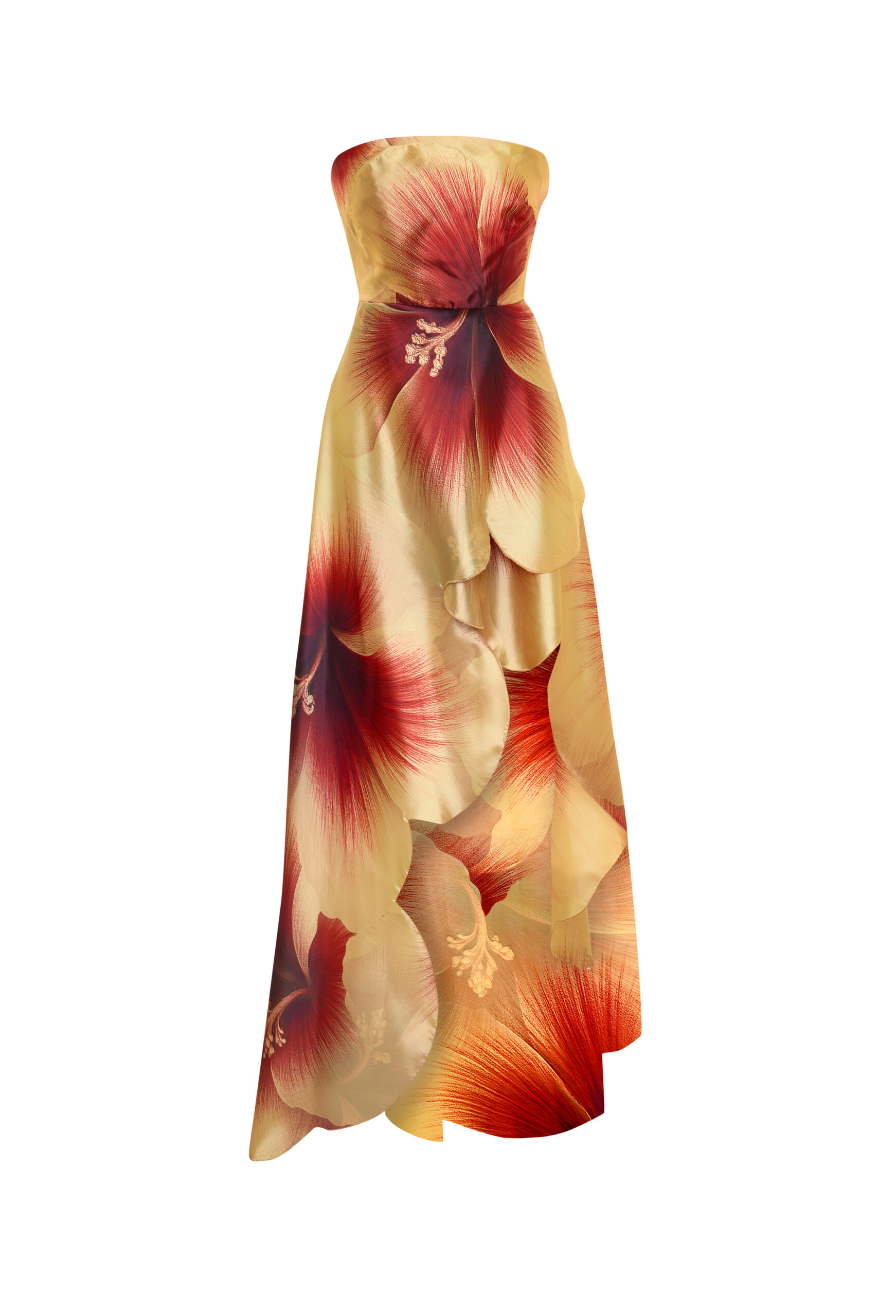 Step into the spotlight with the Alinda Dress, a vibrant strapless gown that blends elegance and ease. Made from silky satin, it showcases a bold floral print in glowing sunset shades. The luminous finish adds a luxurious feel, while the print brings depth and movement to the silhouette.