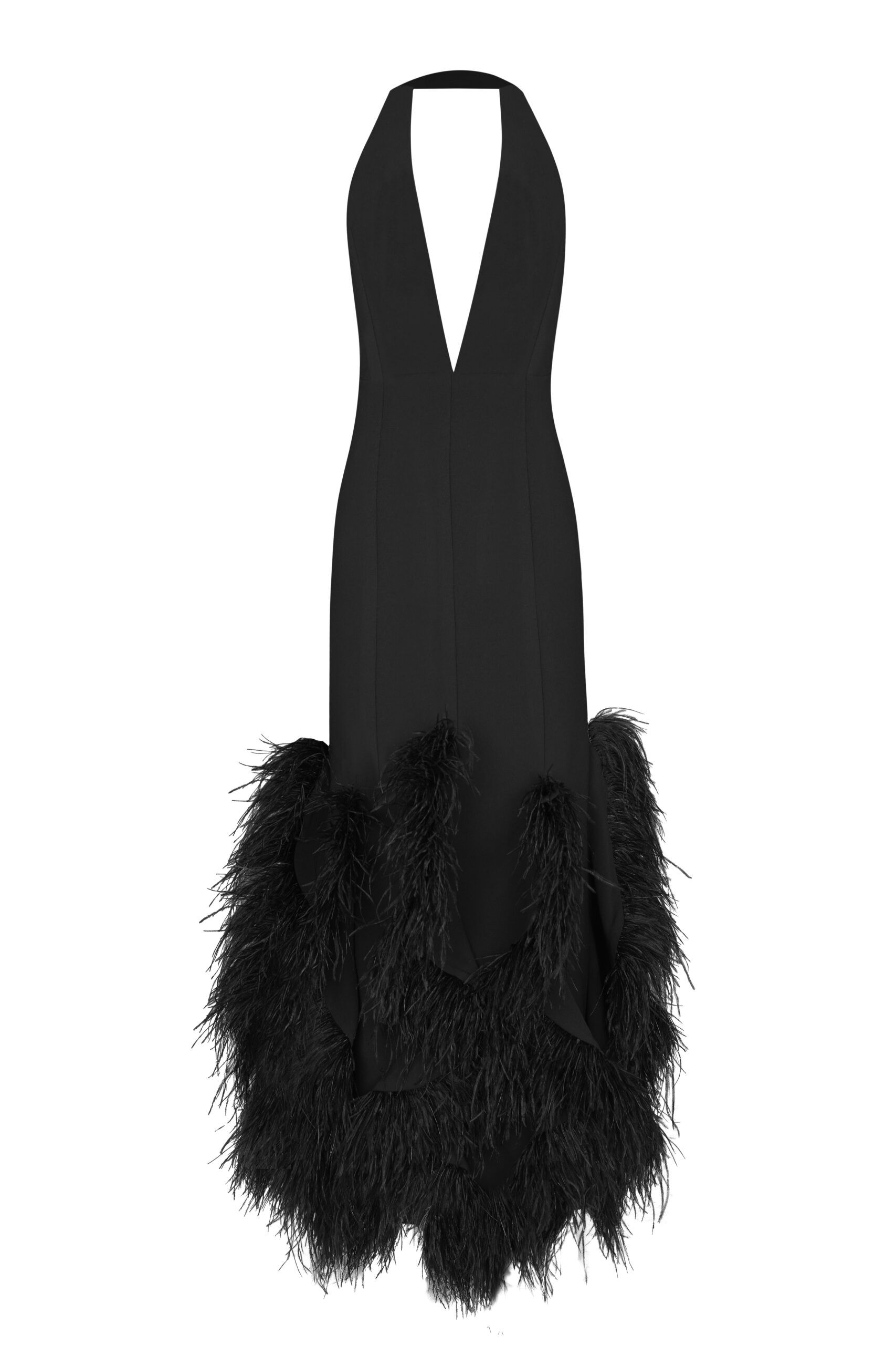 The Amaline Dress is a black crepe halter gown with a sleek, fitted silhouette and open back. Finished with dramatic feather-trimmed panels at the hem, it blends structure with movement. Perfect for galas, formal events, and statement evenings.