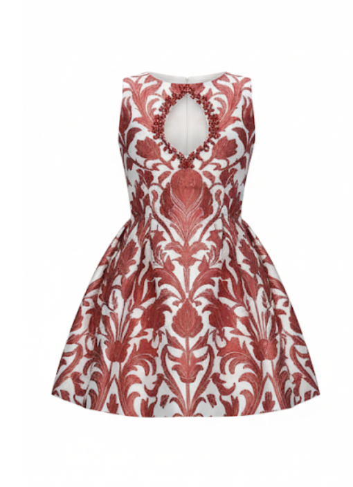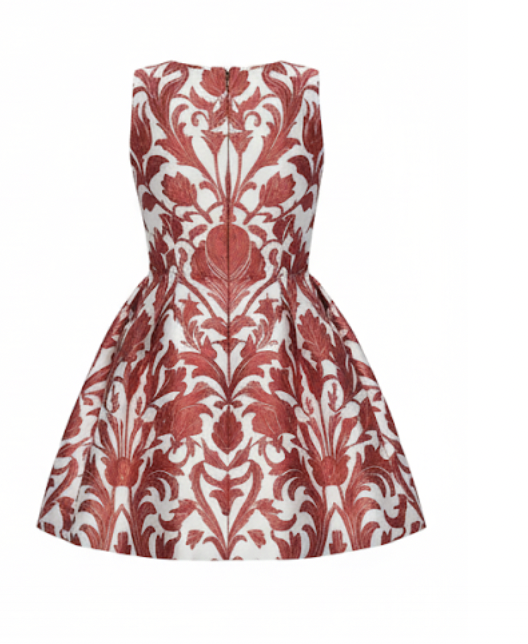 The Caia Dress is bold, feminine, and full of character. It’s crafted from smooth twill satin, giving it a structured shape and a soft sheen. The rich red baroque-inspired pattern stands out beautifully against the ivory base, creating a look that feels both classic and modern.