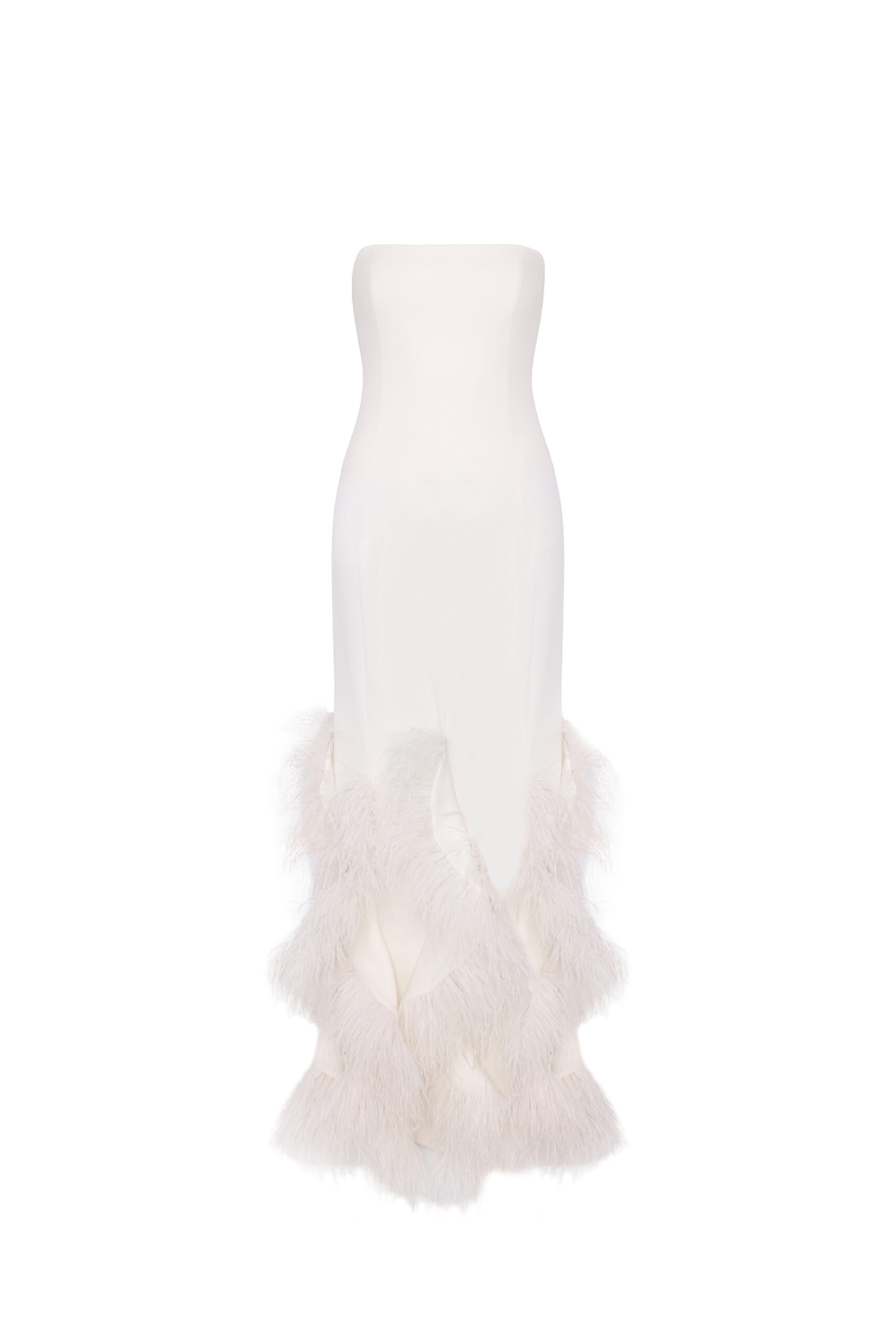 Crafted in a rich ivory fabric that contours the body, the Gaia Dress features a minimalist, structured bodice that seamlessly flows into a floor-length skirt. The true showstopper is the cascading layers of soft, tonal feathers that ripple from mid-thigh to hem, creating luxurious movement and ethereal texture with every step.