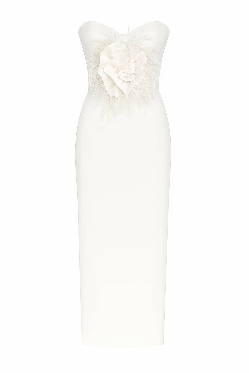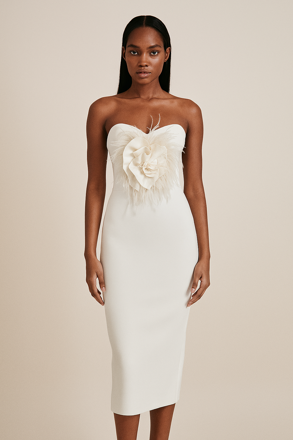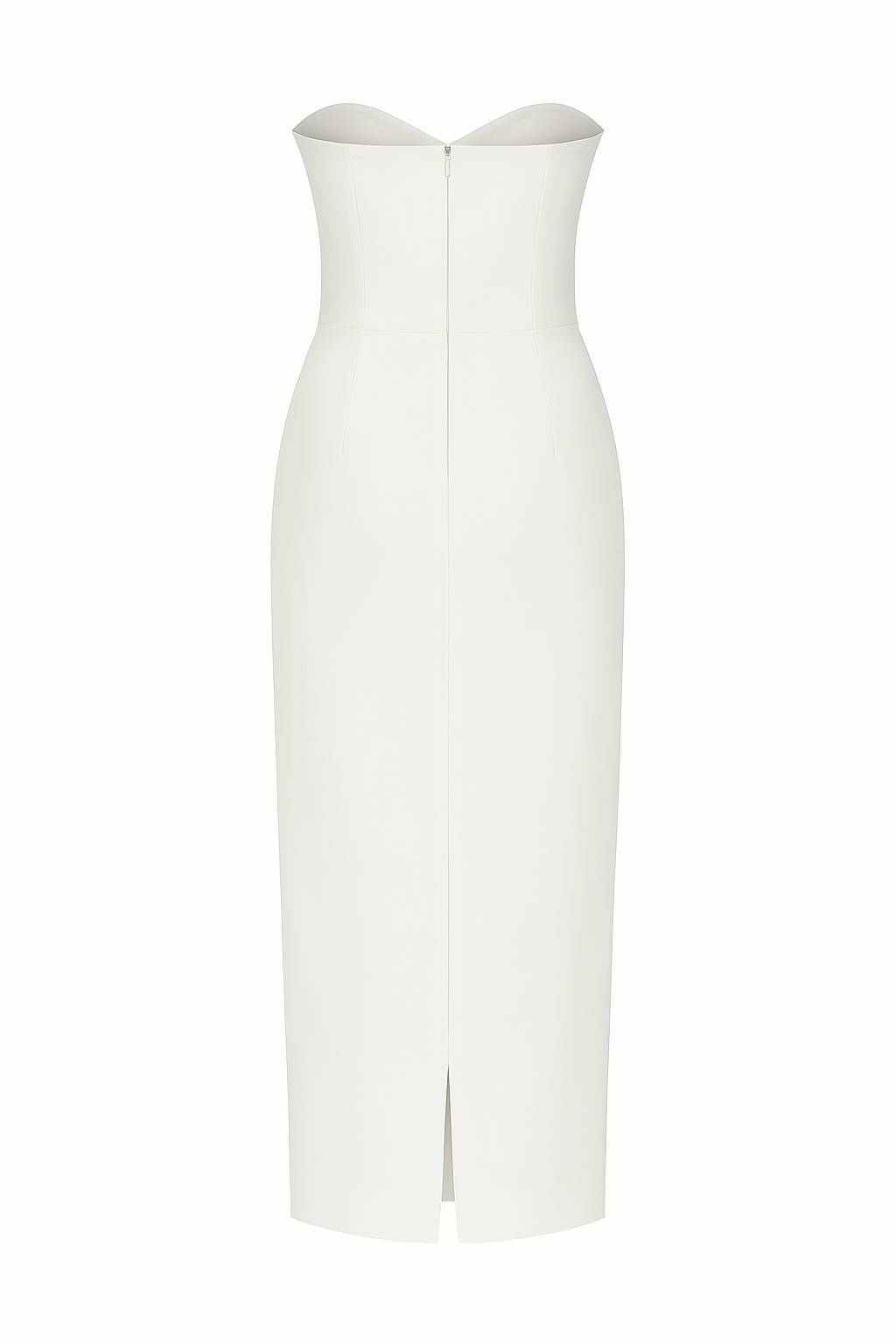 Step into timeless elegance with the Vala Dress. This strapless midi dress is crafted from smooth white crepe, offering both structure and comfort. It’s designed to hug the body in all the right places.